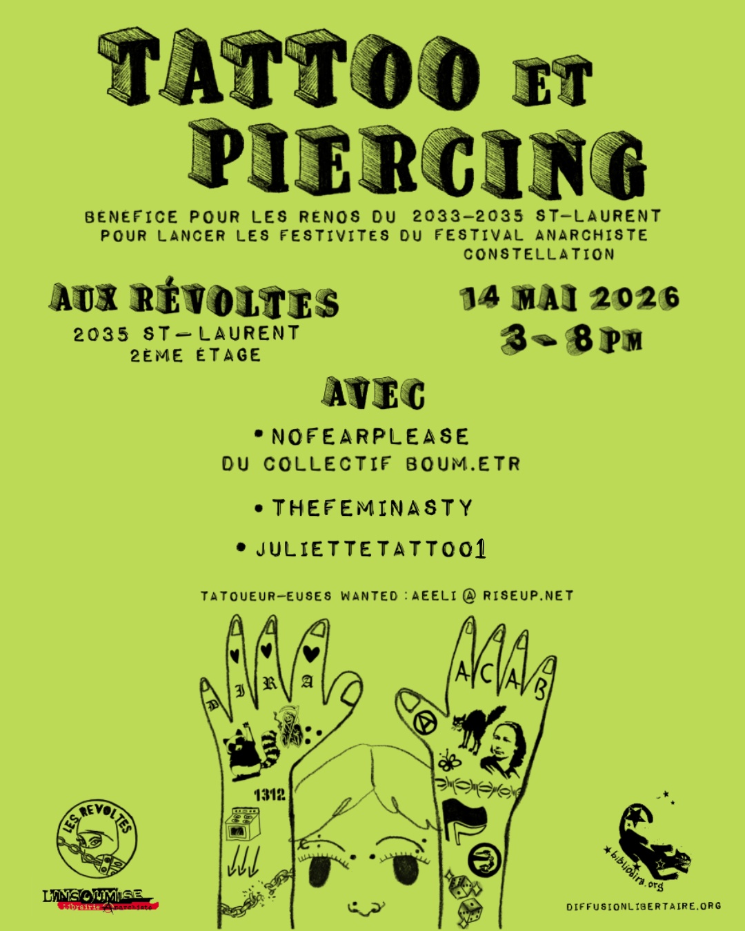 LE COMITÉ RÉNOS DE L'AEELI PRÉSENTE LE TATTOO & PIERCING BÉNÉFICE POUR LES RÉNOS DU 2033-2035 ST-LAURENT (LIBRAIRIE L'INSOUMISE, LES RÉVOLTES & LA BIBLIOTHÈQUE DIRA) À MONTRÉAL AVEC NOFEARPLEASE, THEFEMINASTY & JULIETTETATTOO1.